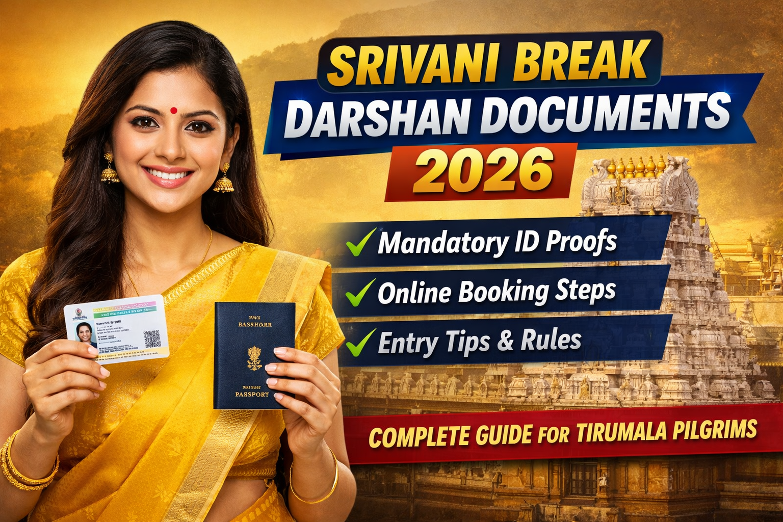 Complete documents checklist for Srivani Break Darshan booking 2026. Know required ID proofs, online booking documents, and verification process for Tirumala temple visit.