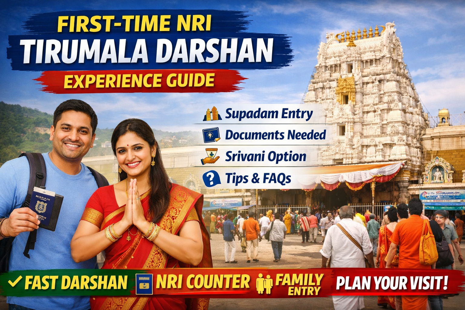 Complete guide on first-time NRI Tirumala darshan with Supadam entry, documents, Srivani option, tips and FAQs for NRIs.