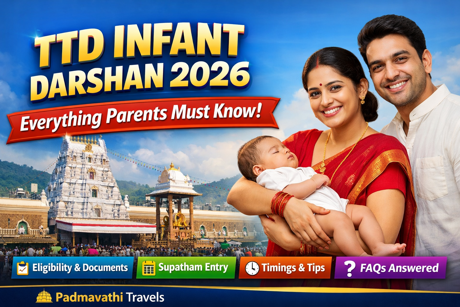 TTD Infant Darshan 2026 guide for parents covering eligibility, age limit, documents, timings, Supatham entry, and FAQs.